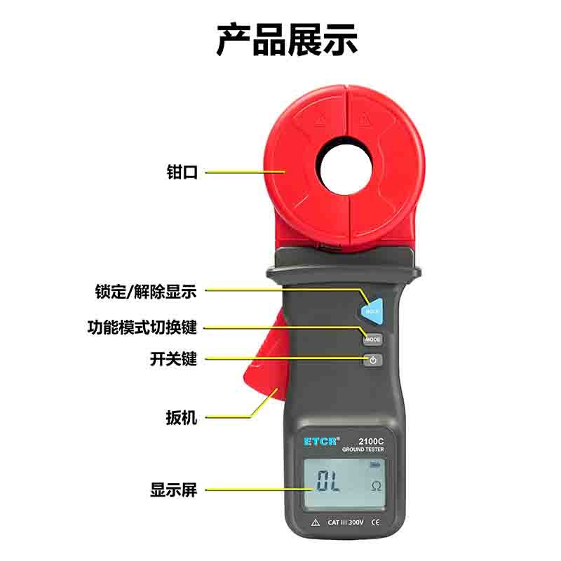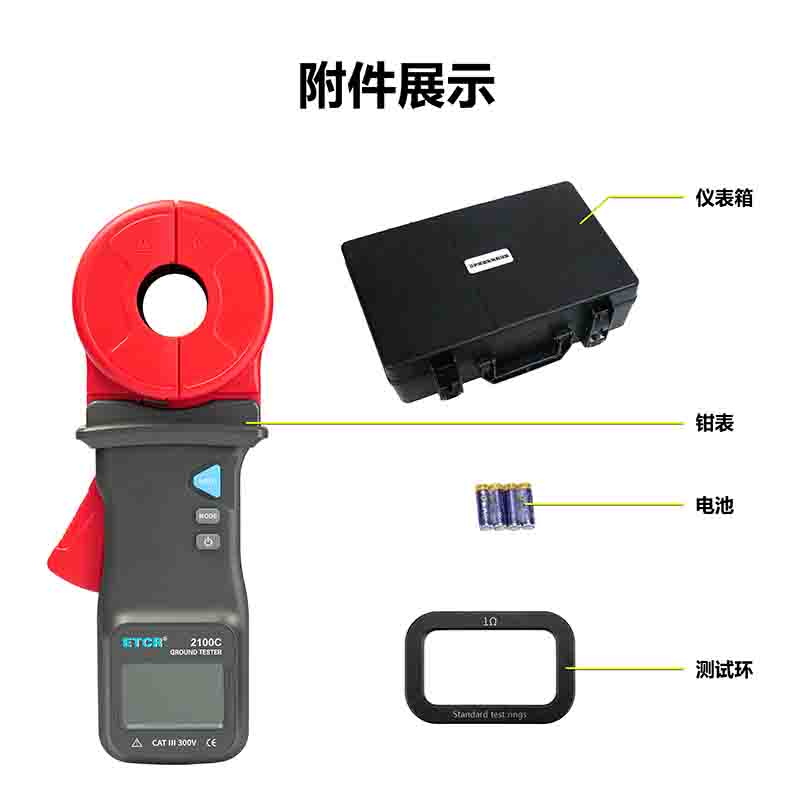 | ETCR2100C鉗形接地電阻儀 | Φ32mm | 0.010Ω~1200Ω | 0.00mA~30A | 有 | 99組 | -- |