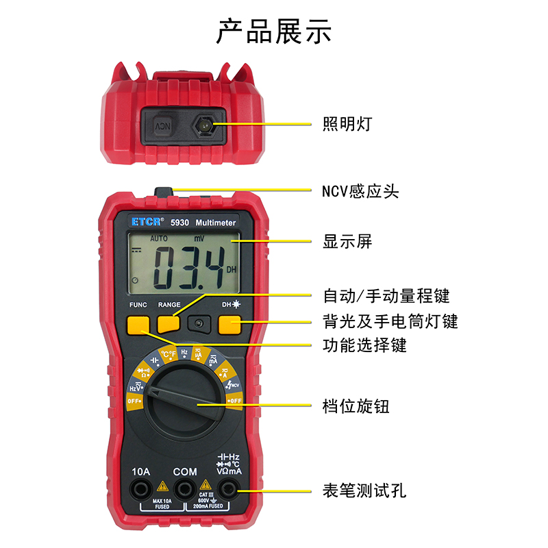 ETCR5930數字萬用表又稱數字萬能表、智能萬用表,是一款3 1/2位便攜式自動量程數字多用表,可測量交流電壓真有效值(TRMS)、直流電壓、交流電流真有效值(TRMS)、直流電流、電阻、頻率、電容、溫度、通斷測試、二極管正向壓降等。該儀表結構精巧、操作容易、攜帶方便,是電工電子測量之理想工具。