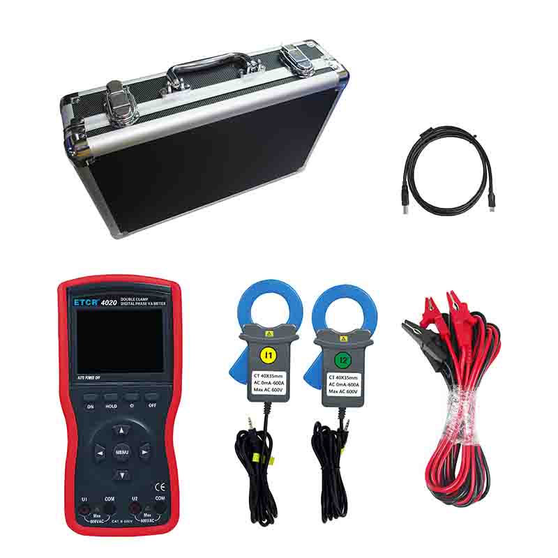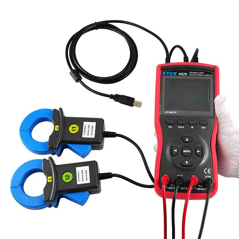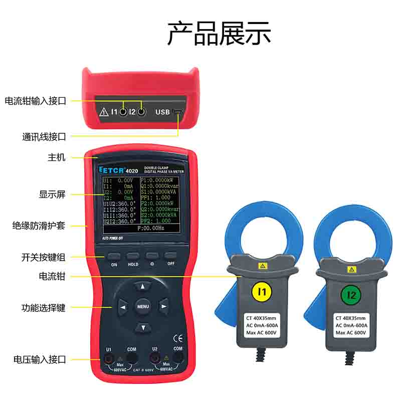 ETCR4020大口徑雙鉗數(shù)字相位伏安表又稱單相相位伏安表、數(shù)字相位伏安表、伏安相位儀、相位測(cè)量?jī)x,用于測(cè)量?jī)陕方涣麟妷?、電流、電壓間相位、電流間相位、電壓電流間相位、頻率、相序、有功功率、無(wú)功功率、視在功率、功率因數(shù)等,判別變壓器接線組別、感性、容性電路,測(cè)試二次回路和母差保護(hù)系統(tǒng),讀出差動(dòng)保護(hù)各組CT之間的相位關(guān)系,檢查電度表的接線正確與否,檢修線路設(shè)備等,為用電檢查人員提供一種安全、準(zhǔn)確、便捷的新型電力儀表。尤其適用于電能計(jì)費(fèi)系統(tǒng)及繼電保護(hù)系統(tǒng),其供電營(yíng)銷部門的電能計(jì)量、用電檢查、電力稽查,生技部門的裝表接電 、繼電保護(hù)、差動(dòng)檢測(cè)、啟動(dòng)試驗(yàn)、變電檢修,或電力實(shí)訓(xùn)、技能比武等。