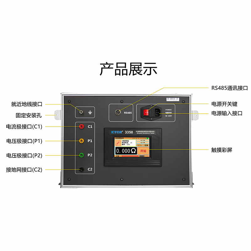 ETCR3350大型地網(wǎng)接地電阻在線監(jiān)測儀根據(jù)《JJG984-2004接地導通檢定規(guī)程電阻測試儀》,《DL/T475-2006接地裝置特性參數(shù)測量導則》,《DL/T845.2-2004電阻測量裝置通用技術(shù)條件第二部分:工頻接地電阻測試儀》生產(chǎn)制造。具有獨特的接地樁及連接線診斷功能和自檢功能,確保測試結(jié)果的準確。儀器采用超強的自動變頻抗干擾技術(shù),配合400V/5A大功率輸出,能在強干擾環(huán)境下準確測得工頻50Hz下的數(shù)據(jù)。
