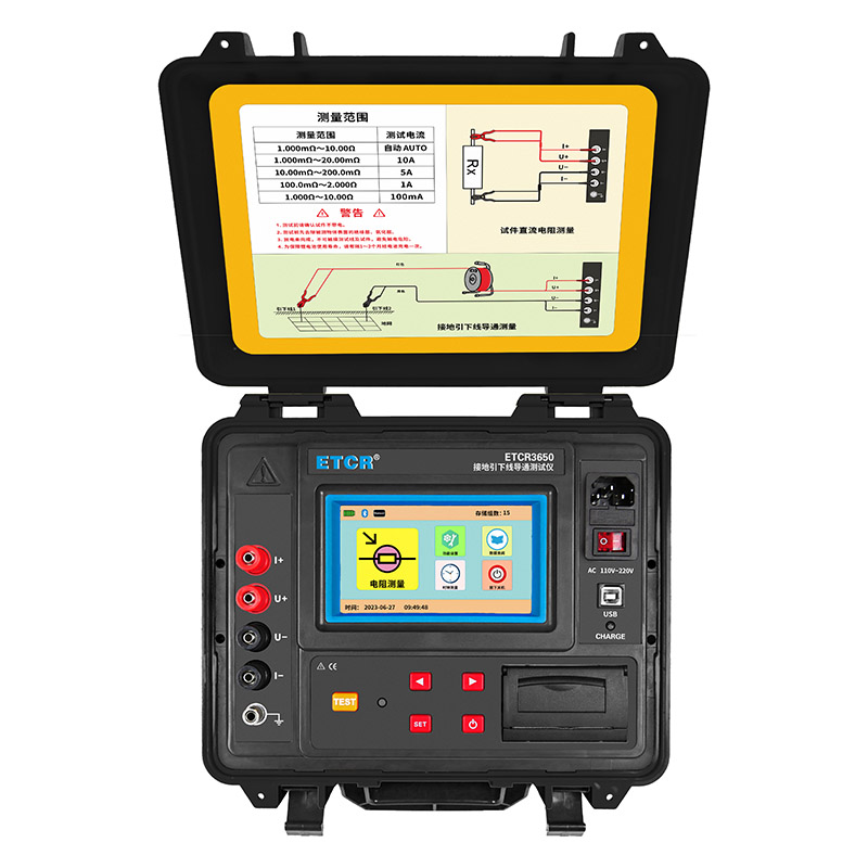 ETCR3650接地引下線導通測試儀專門用于接地裝置的電氣完整性測試,其各項技術指標均達到或優(yōu)于相關標準要求。儀器由主機、測試線等組成,儀表采用微處理機技術,精密四線法測試,準確可靠。儀表有AC220V及大容量鋰電池兩種供電模式,自動測量及手動測量兩種測量模式,儀表采用5寸全彩高清觸摸屏,帶背光調節(jié)功能,強光下清晰可見。儀表外殼采用防水保護箱,防撞、防摔、防水堅固安全耐用,儀表帶有內置打印機、藍牙通訊,USB接口。儀器操作簡單方便、精度高、測試速度快,復測性好、讀數(shù)直觀,是符合規(guī)程要求的理想的專用儀器,大大方便了試驗項目的開展,提高了工作效率。