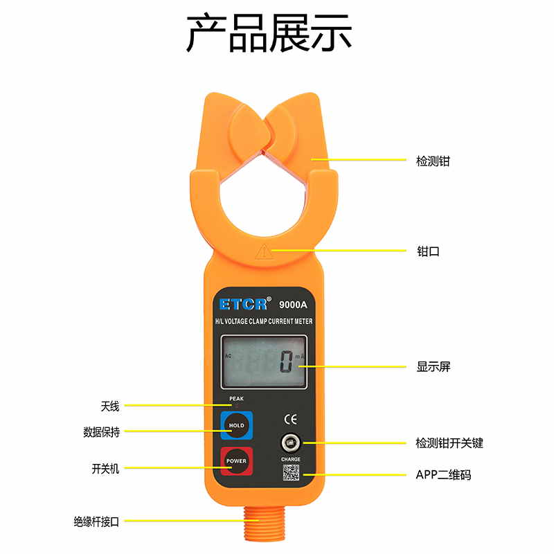 ETCR9000A藍牙版高低壓鉗形電流表又稱架空線路負載測試儀,高壓負載測試儀、高空電流測試儀、高壓電流遙測儀,用于測量架空線路高低壓電流。儀表由專用鉗形電流表配高壓絕緣桿組成。若不使用絕緣桿,還可以當作高精度低壓鉗形電流表使用。廣泛應用于變電站﹑發(fā)電廠﹑工礦企業(yè)以及檢測站﹑電工維修部門進行電流檢測和野外電工作業(yè)等。