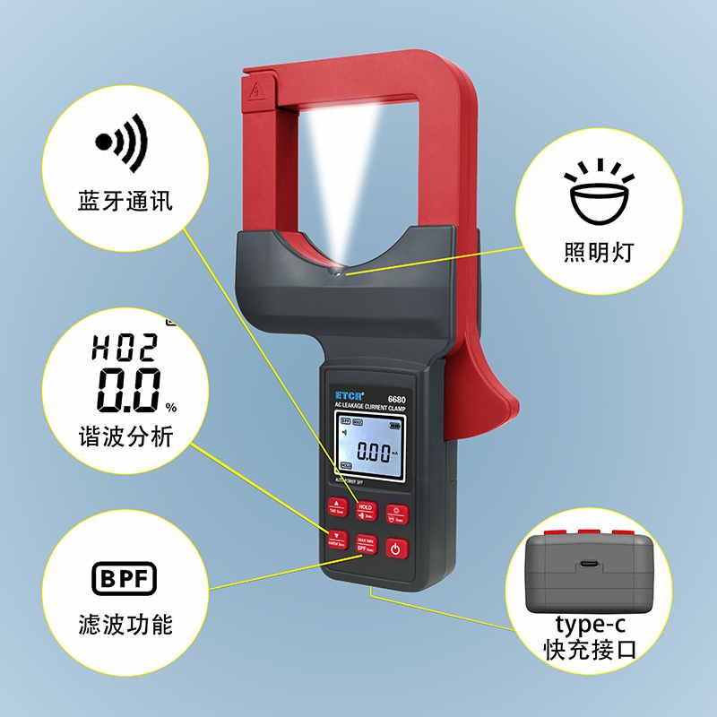 ETCR6680鉗形漏電流表可測試40Hz~1kHz頻率范圍的電流。鉗表還具有背光、手電筒、數(shù)據(jù)存儲、藍牙通訊等功能。鉗表使用大容量鋰電池type-c充電口,是一款新型的電工安全檢測必備工具。