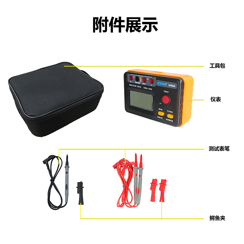 | ETCR3440B絕緣電阻表 | 500V、1000V、2500V | 0.5MΩ~40GΩ | 1mA MAX | AC:0V~600V |