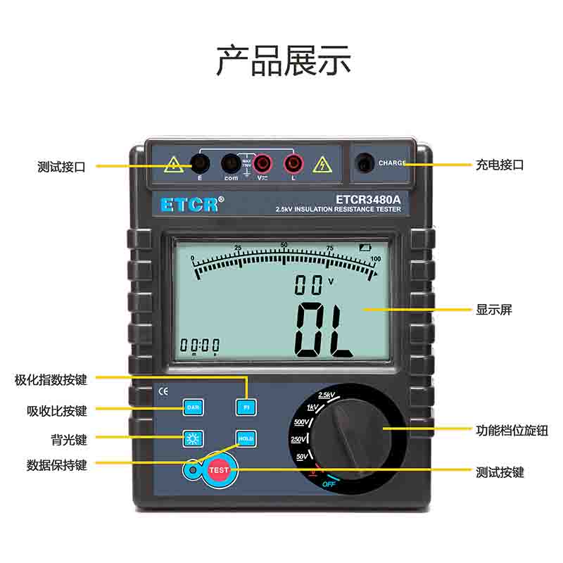 ETCR3480A絕緣電阻表又名兆歐表、絕緣電阻測(cè)試儀,用于絕緣電阻測(cè)試、吸收比、極化指數(shù)測(cè)試、交直流電壓測(cè)試。儀表具有LCD大屏幕帶背光顯示、數(shù)據(jù)保持、自動(dòng)放電、自動(dòng)關(guān)機(jī)等功能。儀表具有測(cè)試計(jì)時(shí),電壓監(jiān)測(cè)功能,回路電壓大于36V時(shí),儀表將禁止測(cè)試以保護(hù)被測(cè)物及人員安全。儀表功能操作簡(jiǎn)易,絕緣電阻值,測(cè)試時(shí)間,輸出電壓同屏顯示,具備交流電壓、直流電壓測(cè)試功能。