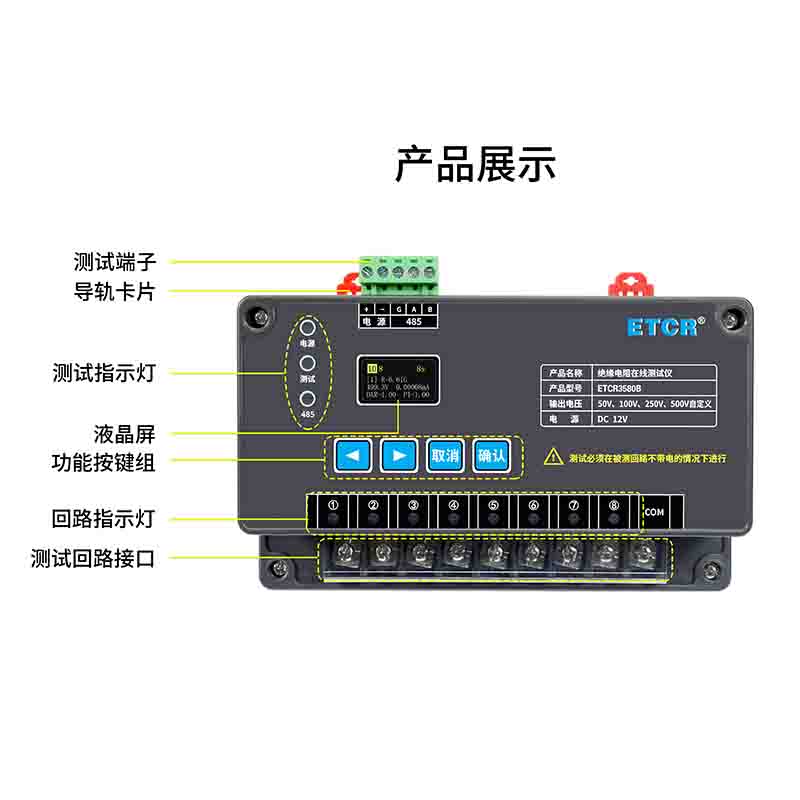 ETCR3580B絕緣電阻在線監(jiān)測(cè)儀又稱絕緣電阻在線測(cè)試儀,用于在線監(jiān)測(cè)電纜、電機(jī)、開關(guān)、電器等各種電器設(shè)備及絕緣材料的絕緣電阻值。監(jiān)測(cè)儀采用高清晰OLED液晶屏,測(cè)試參數(shù)可在儀器按鍵或后臺(tái)設(shè)置,安裝方便,測(cè)試可靠。監(jiān)測(cè)儀可監(jiān)測(cè)1~8個(gè)回路的絕緣電阻值,測(cè)試必須在被測(cè)回路不帶電的情況下進(jìn)行。
