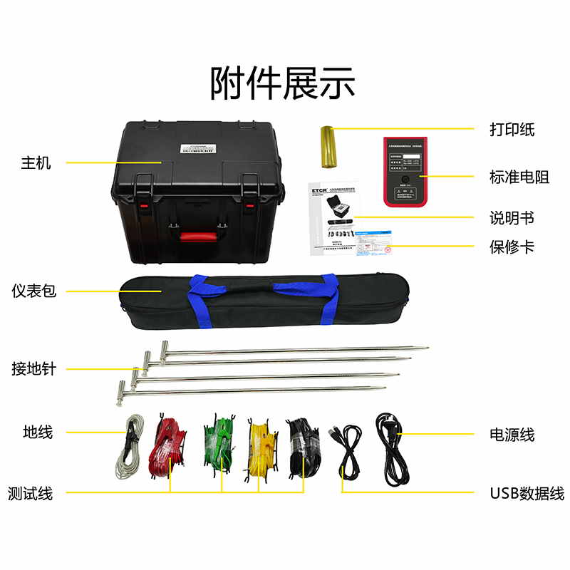 測量大型接地裝置接地電阻,接地導(dǎo)通,土壤電阻率,跨步電壓,接觸電壓,地表電位梯度等。