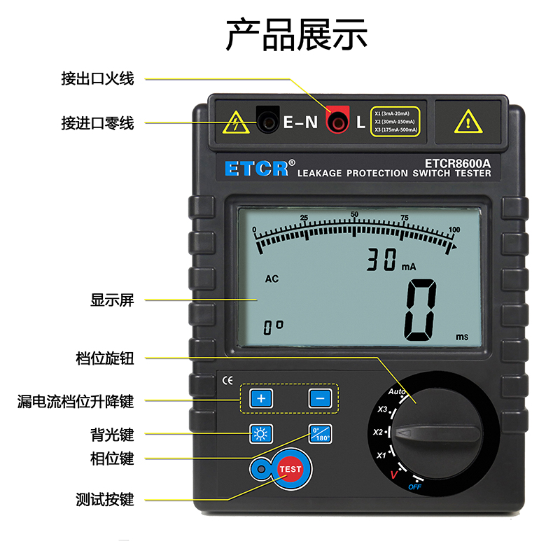 | ETCR8600A漏電保護(hù)器測試儀 | 3mA~500mA,十八檔 | 0ms~999ms | AC 0~600V | 大LCD屏 | 干電池 |