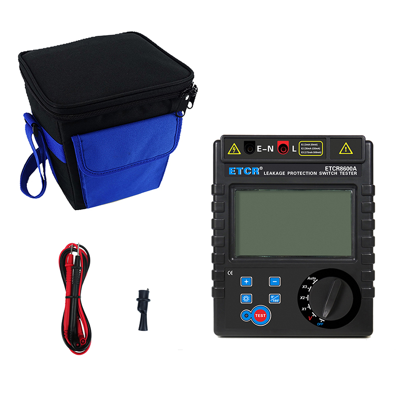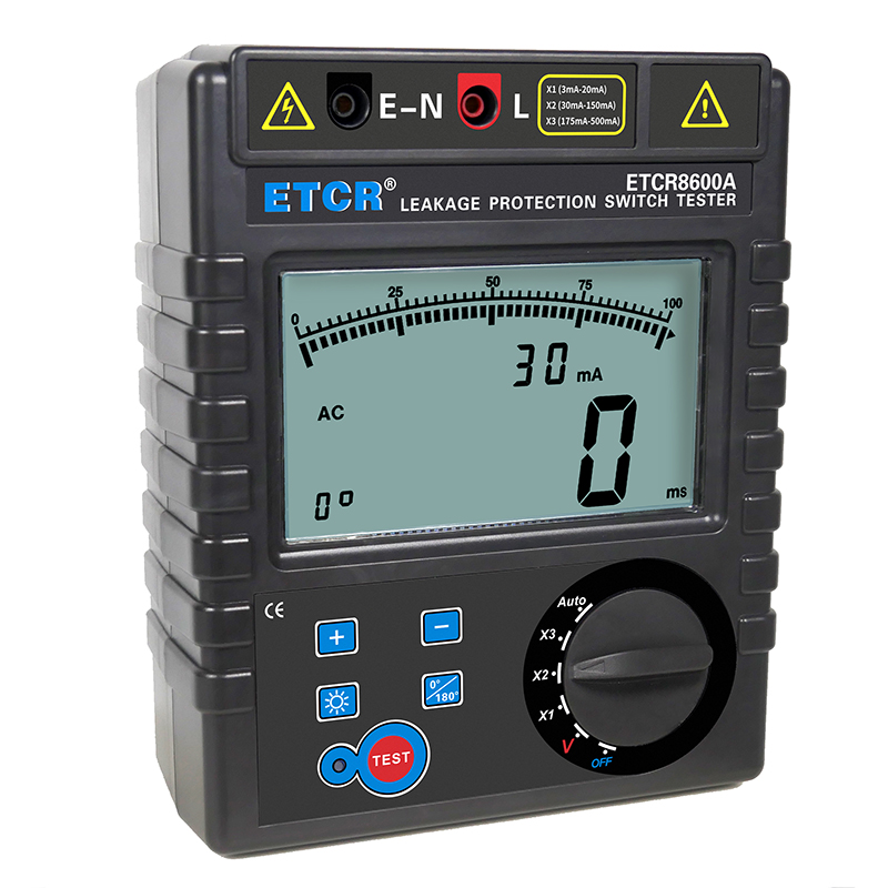 ETCR8600A漏電保護(hù)器測試儀又稱漏電開關(guān)測試儀、漏電開關(guān)特性測試儀,用于現(xiàn)場在線測試各種漏電保護(hù)器的漏電動(dòng)作時(shí)間、以及線路交流電壓。測試電流從3mA~500mA分18檔(3mA,5mA,7mA,10mA,15mA,20mA,30mA,35mA,50mA,100mA,125mA,150mA,175mA,250mA,275mA,300mA,375mA,500mA),測試漏電流動(dòng)作時(shí)間量程為0~999ms。交流電壓量程:0~600V。