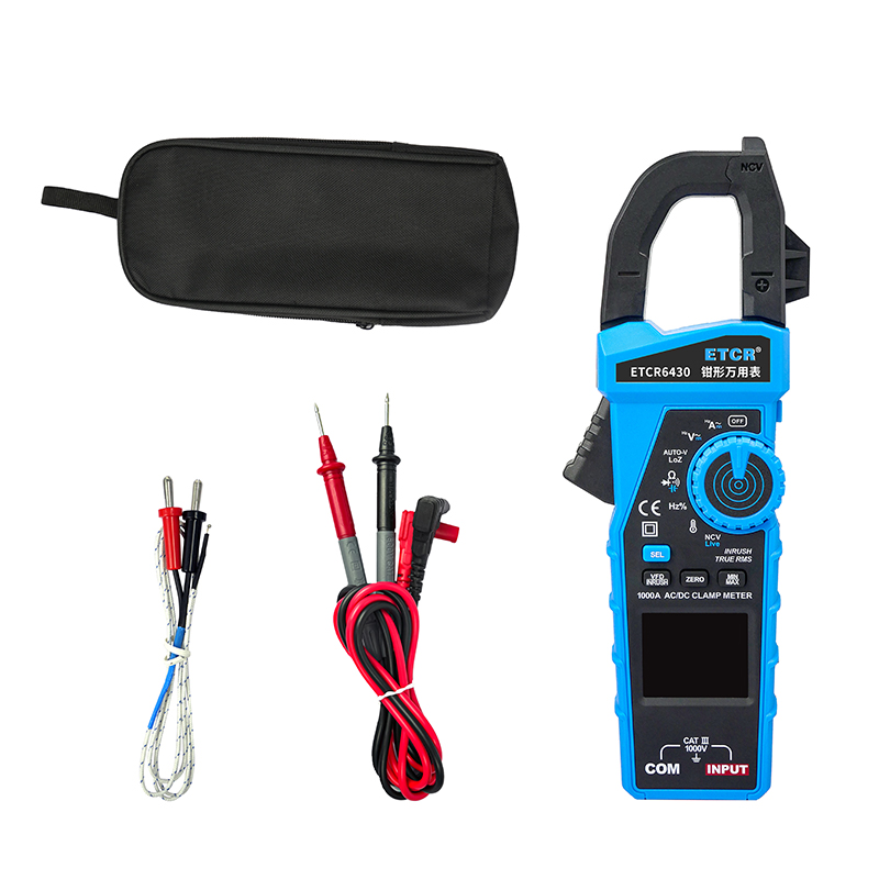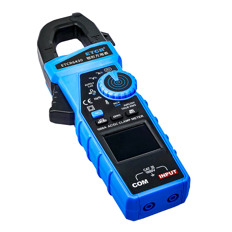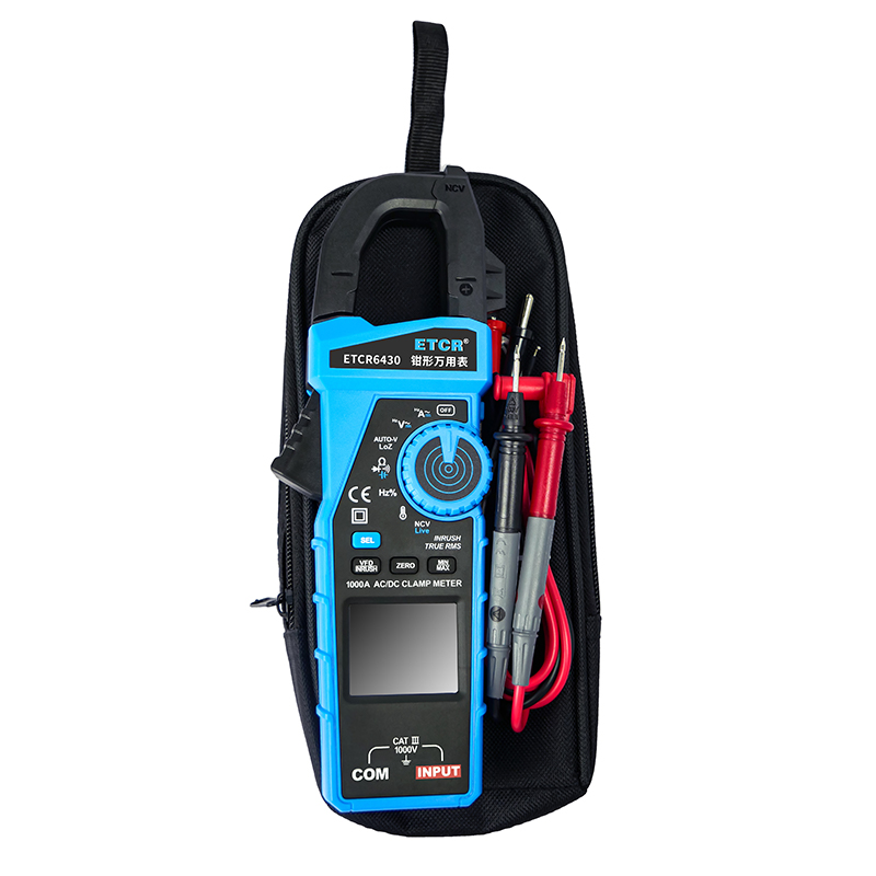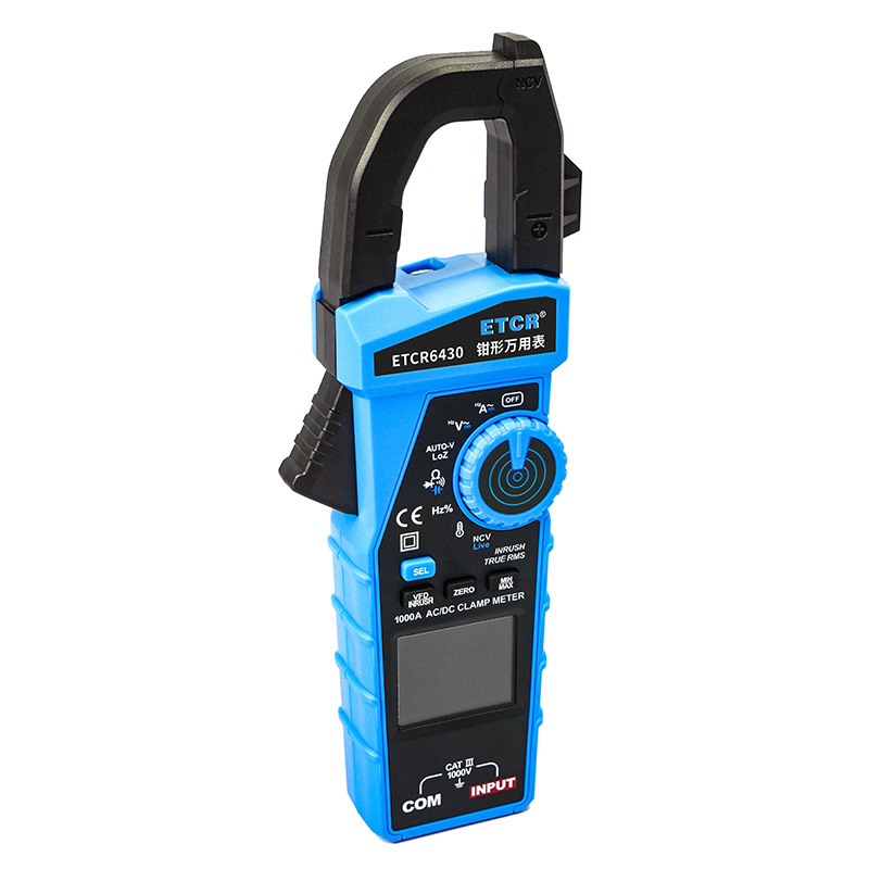 ETCR6430鉗形萬用表可用于測(cè)量交直流電流、交直流電壓、電阻、電容、二極管、線路通斷、頻率、百分比、溫度、NCV、Live以及MAX、MIN、HOLD鎖定、INRUSH、VFD、手電筒、自動(dòng)關(guān)機(jī)、全量程過載保護(hù)、電池電量不足指示等功能。
