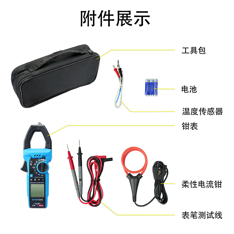 | ETCR6440C鉗形萬用表 | 最大線徑Ф42mm | DC 600mV~1000V AC 0mV~1000V | DC/AC 60A~1000A | 600Ω~60MΩ | 600nF~60mF | —— | -20°C~1000°C |