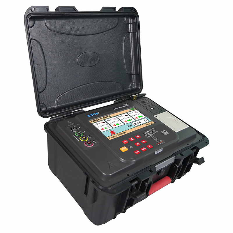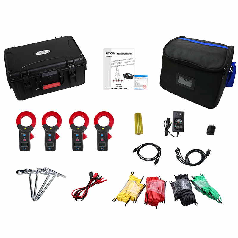 ETCR3250免解扣桿塔接地電阻測(cè)試儀由主機(jī)、4個(gè)電流鉗、測(cè)試線、輔助接地棒、通訊線、打印機(jī)等組成。主機(jī)采用7寸彩屏,電流鉗與主機(jī)采用無線通訊,儀表還具有藍(lán)牙通訊,下載APP后可在手機(jī)進(jìn)行測(cè)試及查看測(cè)試結(jié)果。儀表配有內(nèi)置式打印機(jī),可在現(xiàn)場(chǎng)打印測(cè)試結(jié)果。儀表能存儲(chǔ)100組數(shù)據(jù),通過USB接口及上位機(jī)軟件上傳測(cè)試結(jié)果,實(shí)現(xiàn)歷史數(shù)據(jù)讀取、查閱、保存、報(bào)表、打印等功能。儀表外殼采用防水保護(hù)箱,防撞、防摔、防水(防護(hù)等級(jí)IP65)堅(jiān)固安全耐用,儀表還配有大容量可充電鋰電池組,特別適合在戶外工地使用。